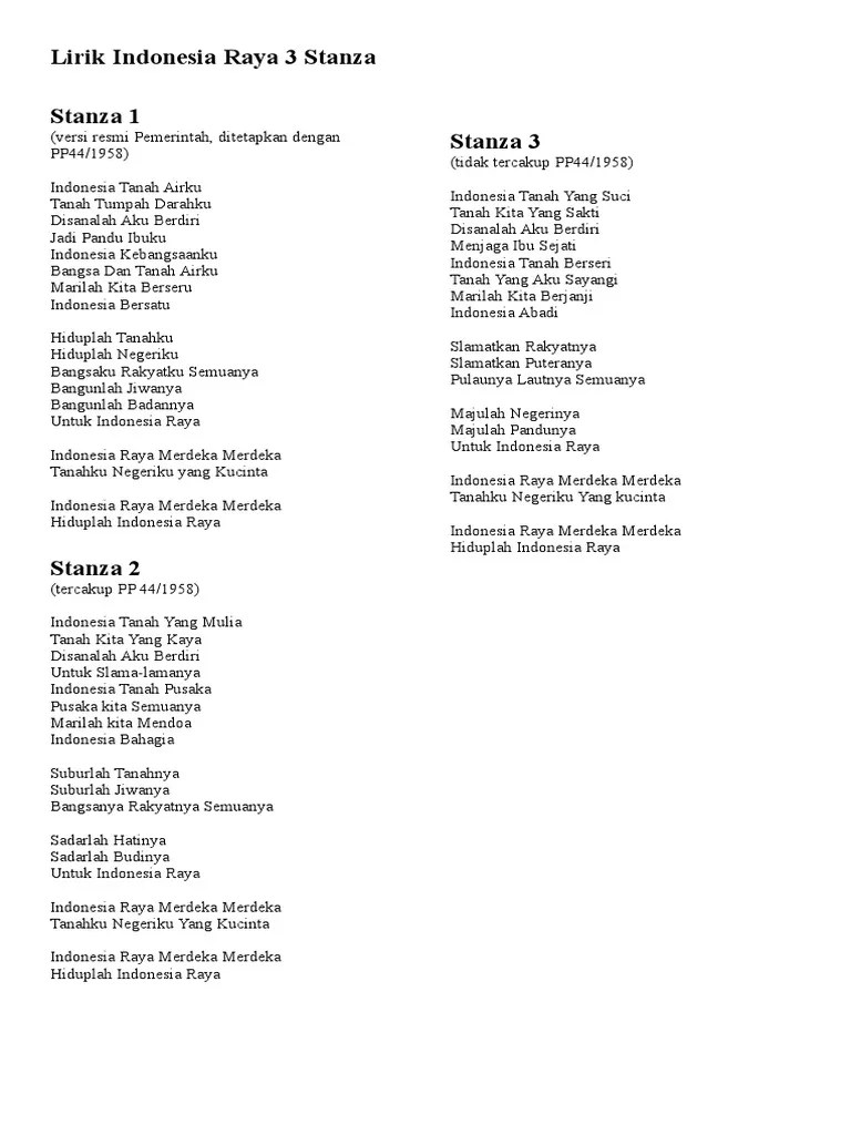 Mungkin hanya sedikit orang yang mengetahui bahwa lagu indonesia raya ciptaan wr supratman ini ternyata memiliki tiga stanza. Indonesia raya stanza pertama yang dinyanyikan dan diperdengarkan saat ini, menekankan pada lirik marilah kita berseru indonesia bersatu. Lagu ini adalah simbol persatuan dan kebanggaan masyarakat indonesia. Stanza 3 (tidak tercakup pp44/1958) indonesia tanah airku tanah tumpah darahku Lagu ini sebenarnya memiliki tiga stanza yang seluruhnya diciptakan oleh wr supratman dan pertama kali dibawakan pada sumpah pemuda, 10 oktober .
